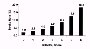 CHADS2 scoring system for assessment of risk of thromboembolism with atrial fibrillationThe CHADS2 scoring system seems to be widely accepted as an easy way to assess risk of stroke in patients with non-valvular atrial fibrillation. The table below describes the factors that are assessed to derive the score.