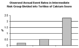 The early uptake of treatment strategies, based on non-randomised trial data may later be supported by confirmatory evidence from randomised trials. However, as was the case with hormone replacement therapy for women or use of folic acid to reduce homocysteine levels, randomised trial evidence may actually refute preconceptions of benefits of certain treatments. New Prospective Trial Data on Predictive Value of Coronary Calcium ScreeningThe use of screening for coronary calcium has been highly controversial. Coronary calcium screening supposedly was driven by companies attempting to promote the use of their fast CT scanners. This lead to strongly held divergent opinions and controversy. One measure of the usefulness of calcium scoring would be to demonstrate that one can refine the risk estimate of future cardiovascular events based on data from Framingham- this refinement may mean that the risk estimate is appropriately increased or decreased in some persons. Retrospective analysis of data had suggested coronary calcium screening did provide additional information. Prospective data are beginning to emerge. The St Francis Heart Study (J Am Coll Cardiol 2005;46:xxx-xxx) suggests calcium scores is better than the Framingham risk estimate. One of the findings of the study relate to those that have a Framingham risk estimate of 10-20 percent for cardiovascular events over ten years. Calcium scoring helped identify those whose risk was lower than predicted and a high risk group whose risk was higher than predicted. This is shown in the graphic below demonstrating marked differences in event rates in this intermediate risk group when the group was divided into tertiles of calcium score.